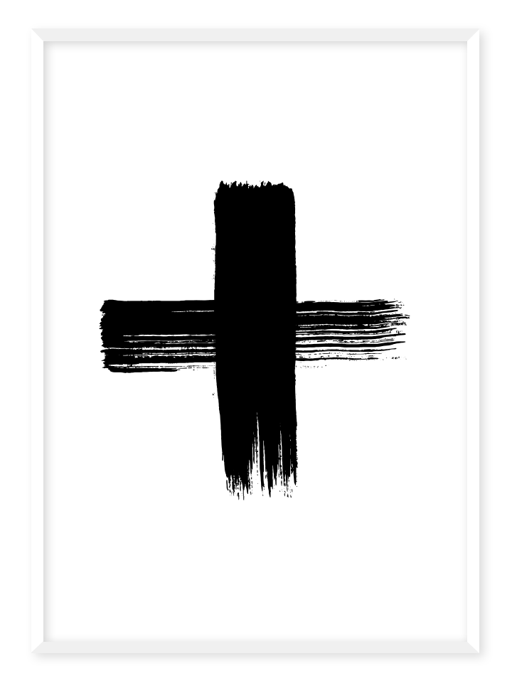 Grafisk poster med ett kors. Finns även med svart bakgrund och vitt kors.